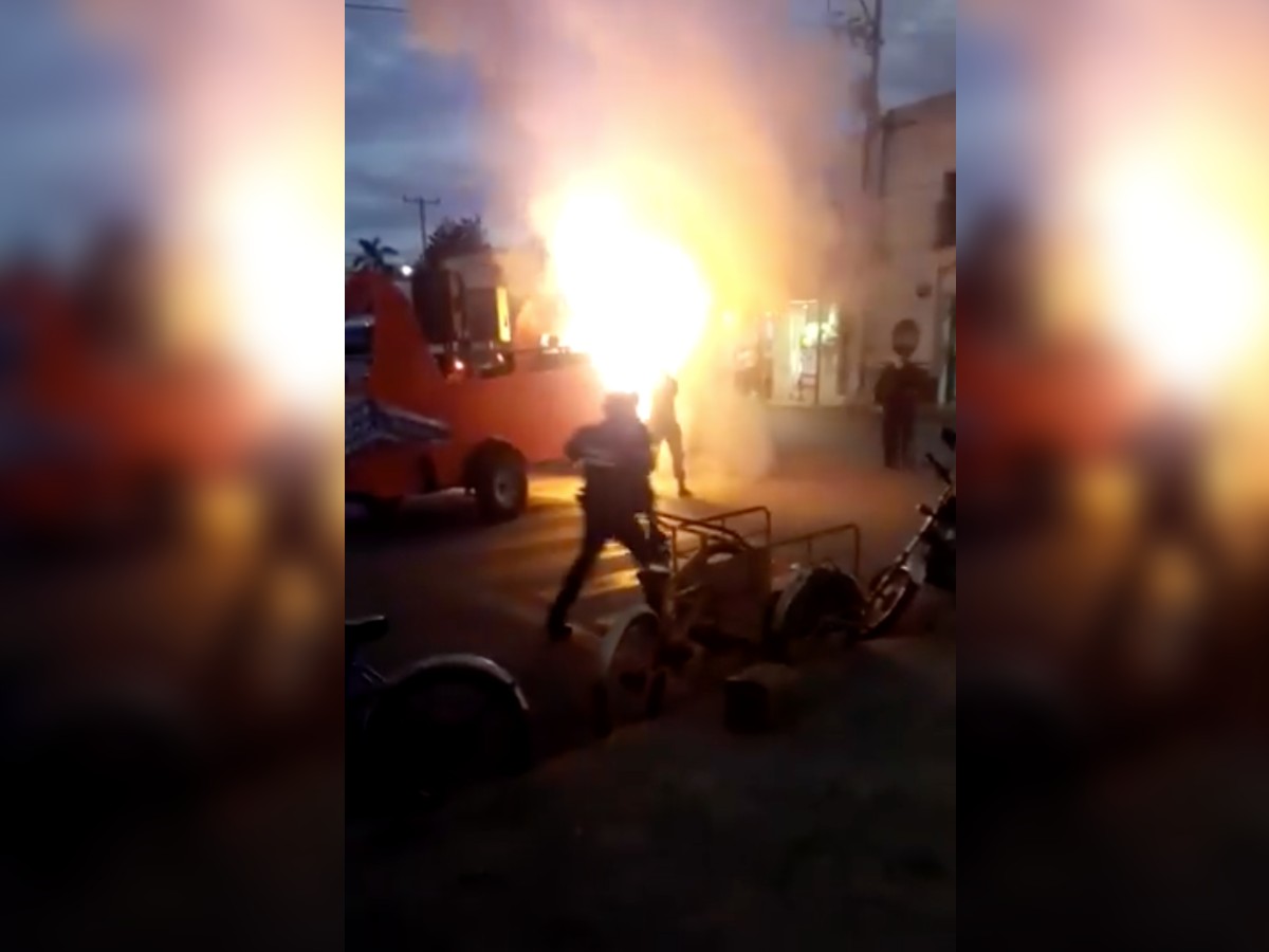 El incidente ocurrió aproximadamente a las 6:15 de la tarde del 24 de febrero. El vehículo que transportaba a Paloma Natasha Catzín Díaz, conocida este año como la reina ‘Paloma I’, pasaba a pocos metros del Palacio Municipal de Peto cuando se escuchó una pequeña explosión. En pocos segundos las llamas devoraron una camioneta roja que llevaba la planta generadora de energía del carro alegórico de Catzín. Debido a esto, la joven y sus acompañantes salieron huyendo del transporte.