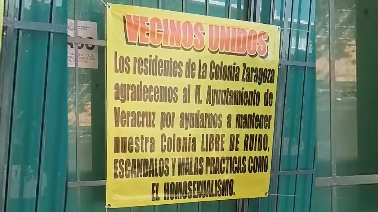«VECINOS UNIDOS. Los residentes de la Colonia Zaragoza agradecemos al H. Ayuntamiento de Veracruz por ayudarnos a mantener nuestra colonia LIBRE DE RUIDO, ESCANDALOS (SIC) Y MALAS PRACTICAS (SIC) COMO EL HOMOSEXUALISMO».